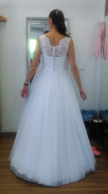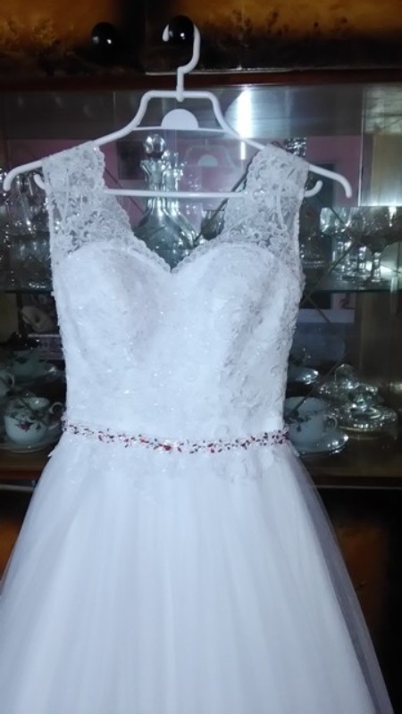 Sprzedam białą suknię ślubną. Góra wykonana jest z pięknej koronki. Tył zapinany na zamek i efektowne guziczki. Dół w kształcie litery A wykonany jest ze zwiewnej siateczki z tiulu, która nadaje jej lekkości. Podstawa sukni to halka na kole. W talii znajduje się ozdobny pasek z czerwonymi i srebrnymi koralikami, który w razie potrzeby można odjąć. Suknia dopasowana była do moich wymiarów: biust 88 cm, pas 70 cm, biodra 92, wzrost 165 + szpilki 8 cm. Suknia została wyczyszczona w pralni chemicznej.