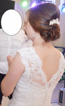 Do sprzedania suknia ślubna koloru białego. Suknia posiada wykończenie z koronki (gorset i zakończenie sukni), dodatkowo wzdłuż dekoltu i wycięcia na plecach zostały wszyte koraliki, kryształki. Suknia szyta na miarę, rozmiar 36/38 wzrost 166cm+7cm obcas. Z tyłu suknia zapinana na zamek oraz ozdobne guziki.