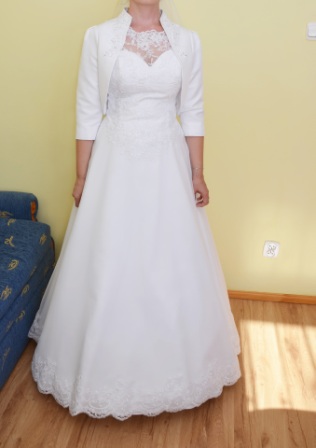 Wraz z suknią do sprzedania posiadam bolerko o rękawie 3/4, które posiada zdobienia z tej samej koronki i koralików oraz welon.