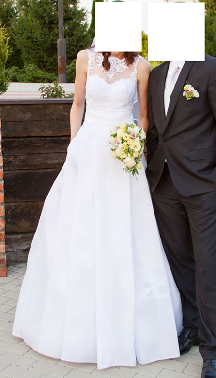 Sprzedam sukienkę ślubną, jest zapinana na guziki pod którym znajduje się ukryty zamek, posiada też ukryte kieszenie. Suknia ta była szyta na miarę 34/36, (najlepiej przymierzyć). Ubrana tylko w dniu wesela, do sukni dołączam bolerko i welon.