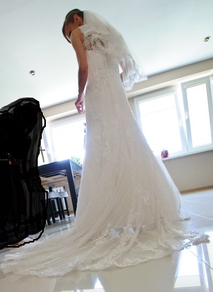 Oferuję na sprzedaż zmysłową suknie ślubną Fara Sposa model 5001. Suknia kupiona w salonie Nicole w Poznaniu. Rozmiar na metce sukienki to 38 jednak została pomniejszona do rozmiaru 36 (zmodyfikowany jest również tren). Suknia jest koronkowa w świetle pięknie się mieni, pod biustem posiada ozdobny pasek zakończony ozdobną klamra (jak na zdjęciu). Suknia koloru Ivory (złamana biel). Suknia jest w stanie bardzo dobrym, posiada dwie niewielkie, niewidoczne dziurki w koronkowym trenie. Tren podpinany na trzy guziczki, które są ukryte pod ozdobnym paskiem (po podpięciu w ogóle nie jest widoczny a całej sukience nadaje jeszcze piękniejszy kształt). Do sukni dokładam koło. Ponoszę koszty czyszczenia. Istnieje możliwość obejrzenia i przymierzenia sukni (należy wcześniej ustalić termin). Welon nie jest przedmiotem aukcji.