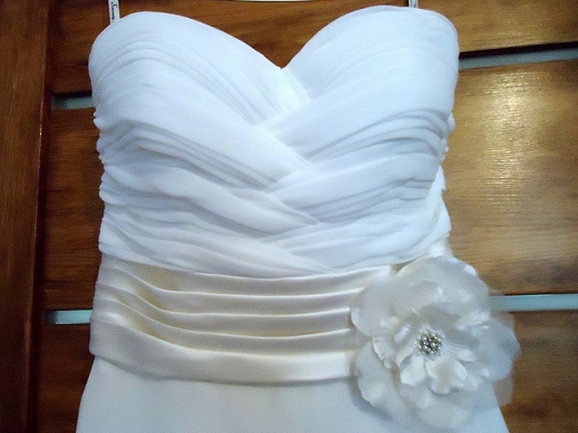 Dekolt w kształcie serca. Przy pasie znajduje się efektowny kwiatek.