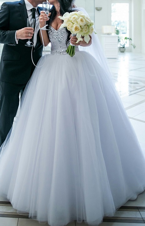 Koronkowy gorset jest bogato zdobiony pięknymi kamieniami Swarovskiego, dół sukni jest z obszernego tiulu. Kilka kamieni odpadło podczas czyszczenia. Ale można dokupić podobne (kilka nawet mam które odpadly) i bez problemu przyszyć. Rozmiar 36-38.