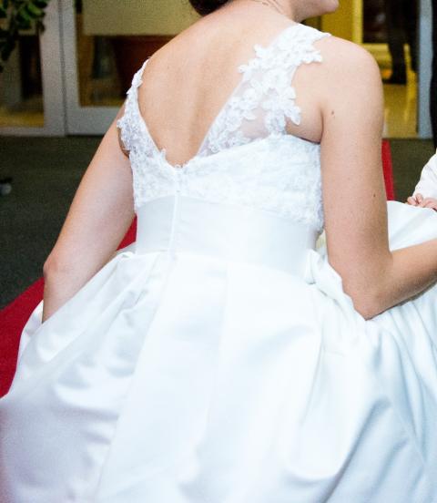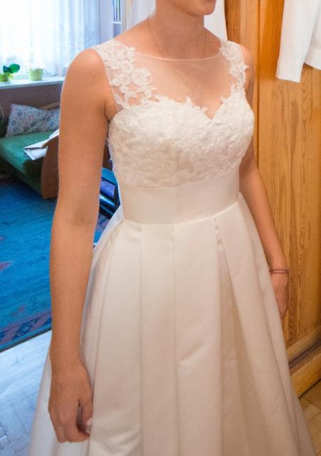 Góra jest koronkowa, spódnica satynowa z zakładkami.