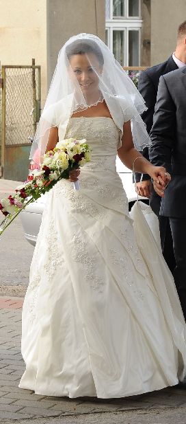 piękna suknia ślubna zakupiona w firmowym salonie Agnes w Poznaniu, rozmiar 38 na 165 cm. Posiada ręcznie naszywane koronki z perełkami oraz tren - mocowany na sznureczki. Atutem sukni jest podwójne zapięcie (zamek+sznurki), co powodowało, że suknia była stabilna i nie zsuwała się. W cenie jest również halka oraz welon.