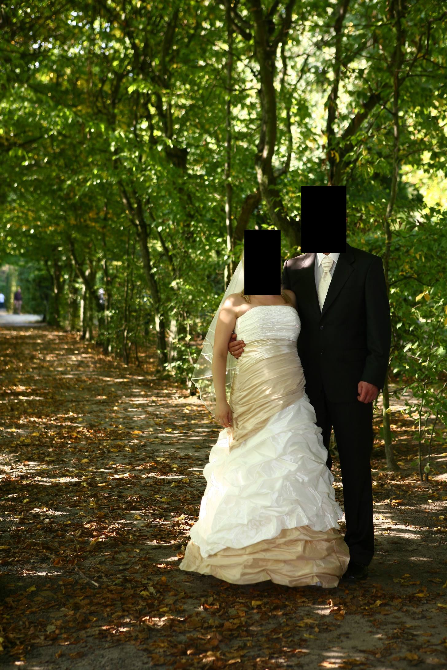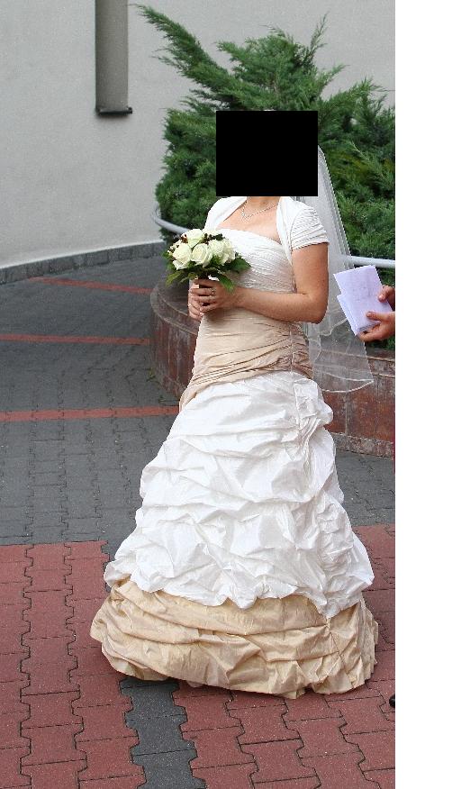 Suknię i bolerko wyczyszczono, usługę wykonała pracownia pani Matuszewskiej. Suknia kosztowała 2900 PLN, oferowana cena jest mniejsza prawie o połowę. W cenę wliczone bolerko w kolorze ecru. Opcjonalnie mogę dołączyć welon z wszytymi kryształkami Swarovskiego, ale po uprzednim ustaleniu ostatecznej ceny sukni.