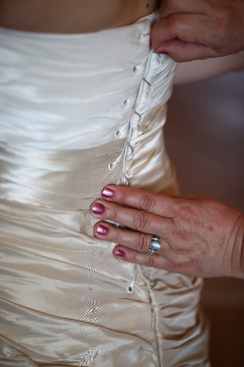 Suknia jest z tafty inteligentnej w kolorze ecru, z domieszką cappuccino, jasnego i ciemnego złota oraz z kryształkami Swarovskiego na biuście. Suknia posiada halkę z kołem. Wiązanie z tyłu umożliwia zwężenie/poluzowanie sukni w miarę potrzeby.