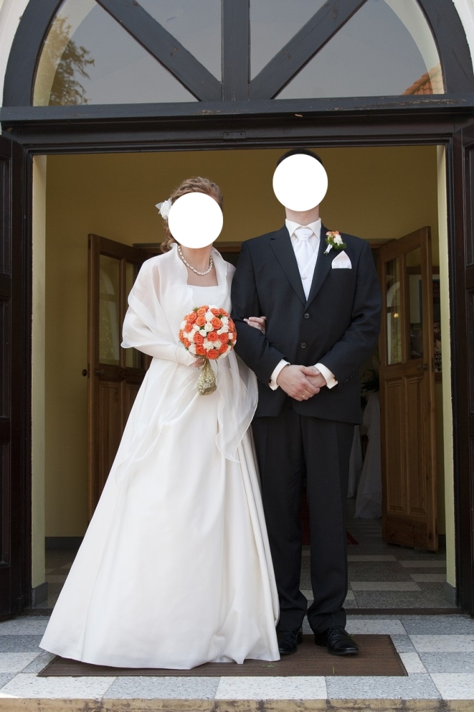 Góra sukni jest bardzo dobrze wyprofilowana i dopasowana. Pięknie podkreśla biust oraz talię. Utrzymuje suknię na swoim miejscu podczas wszystkich szaleństw na parkiecie :) Halka jest wszyta w suknię. Zapięcie jest na zamek który przykrywa rząd guziczków. Ponadto gorset ma wszyte 2 wewnętrzne pasy. Moim zdaniem zaletą tej sukni oprócz jej klasycznego piękna i prostoty jest jej lekkość i wygoda.