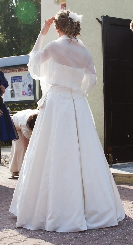 Suknia w stanie bardzo dobrym założyłam ją raz na ślub w sierpniu 2011 roku, po profesjonalnym czyszczeniu, gotowa do założenia.
