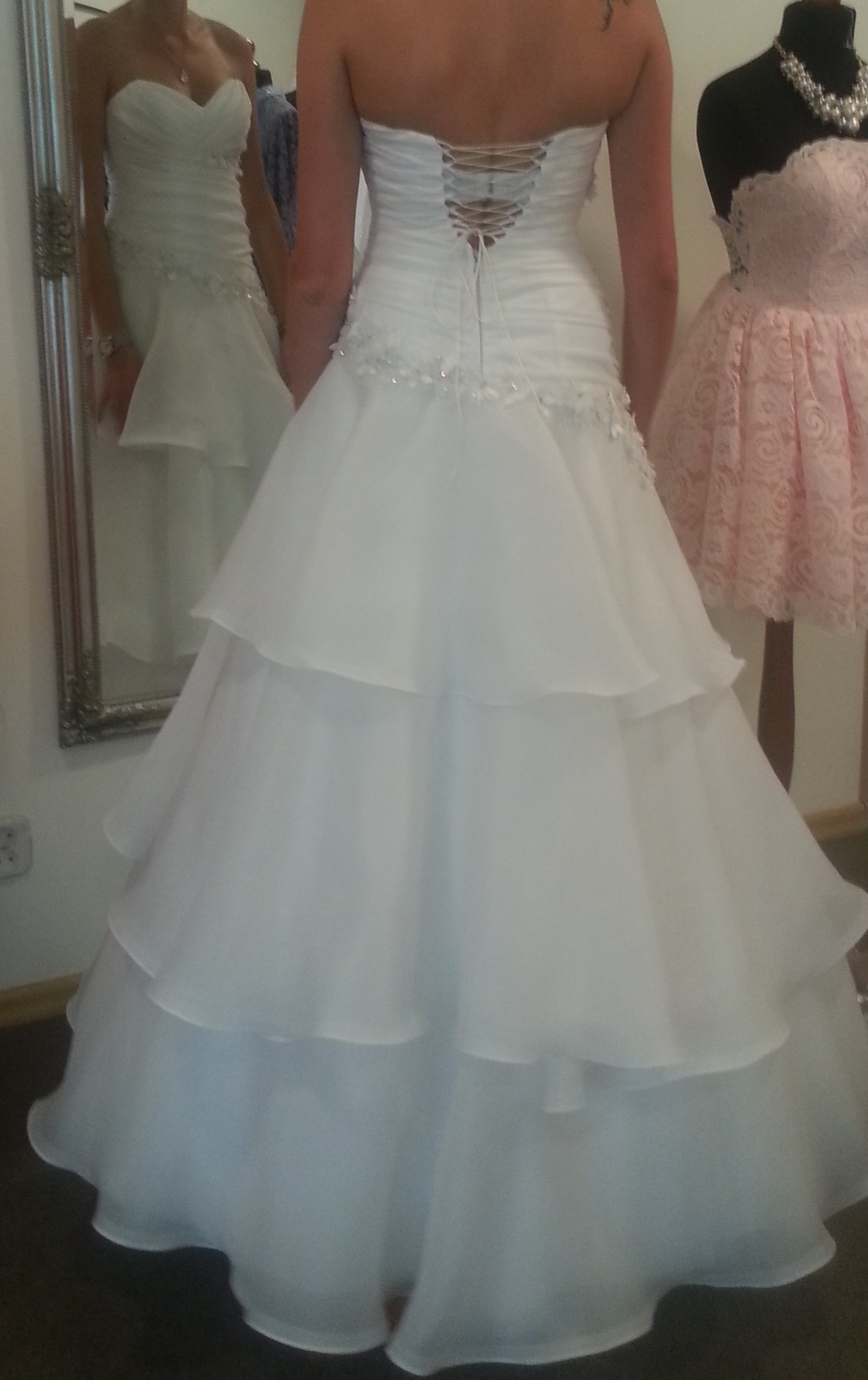 Sukienka nie zniszczona,z gorsetem bez ramiaczek. Dołączone jest koronkowe bolerko odpinane na plecach i welon obszyty kryształkami.