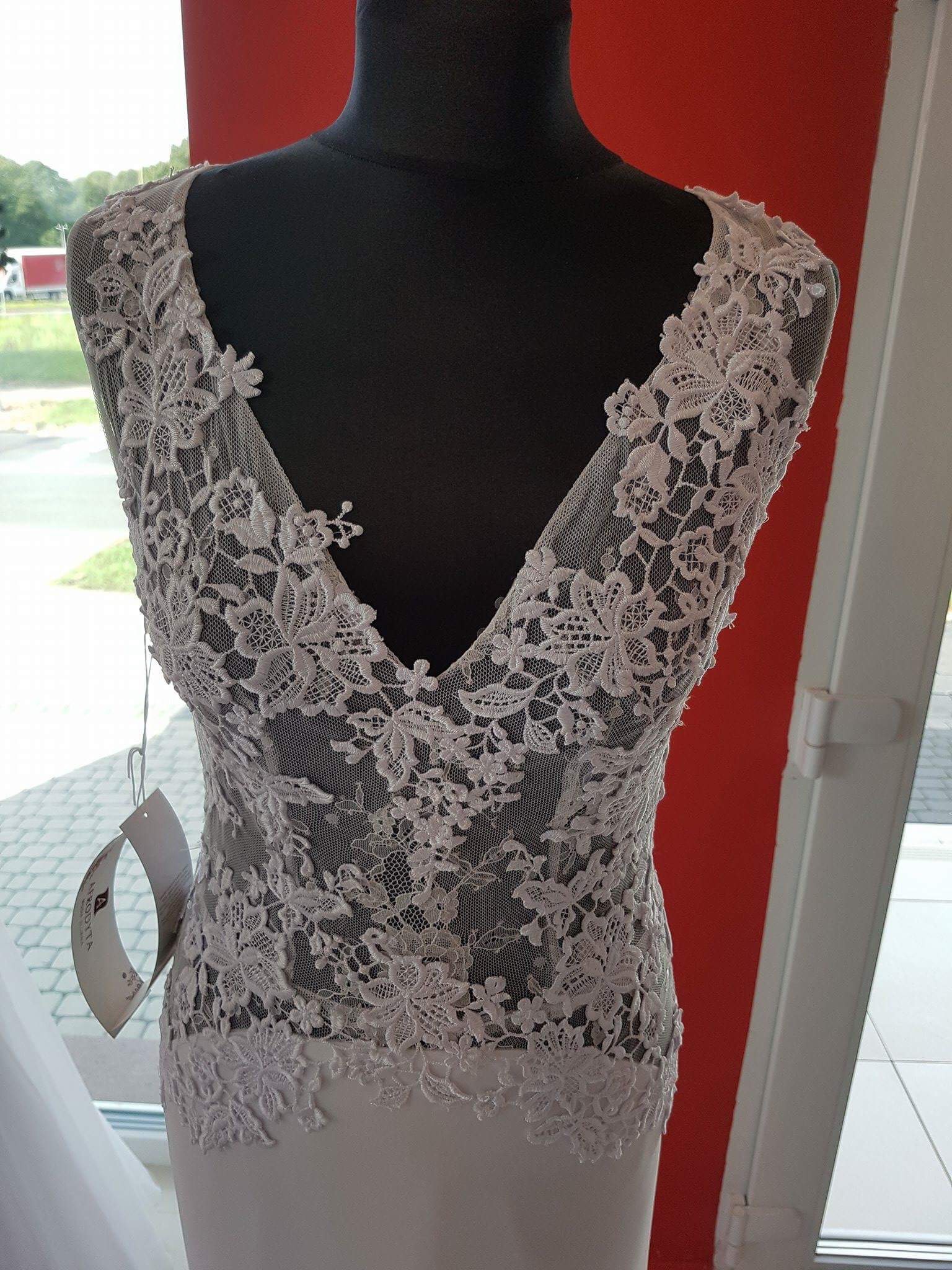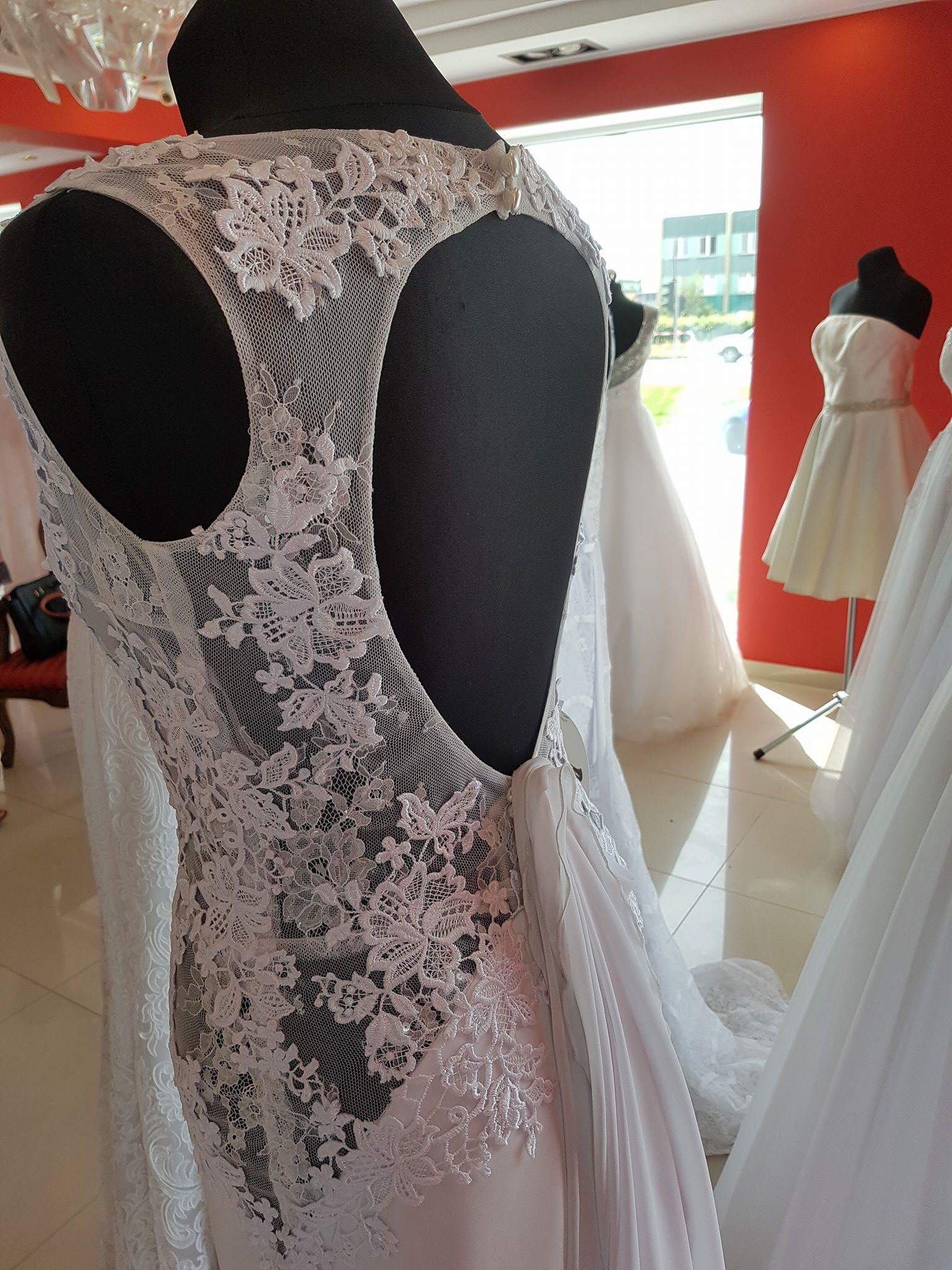 Suknia nowa, kupiona w salonie. Rozmiar 34/ 36 , wzrost 160 + około 5 cm obcas. Suknia do pasa zarówno z przodu jak i na plecach bogato zdobiona koronką. Bez dodatkowych siateczek. Sama koronka. Od pasa w dół prosty materiał " muślin" Suknia zapinana na suwak. Dodatkowo długi przepiękny tren z możliwością podczepienia na guziczki. Ja osobiście tren miałam zahaczony na palcu, bo pięknie dodawał uroku podczas tańca. Suknia założona do ślubu i na sesję zdjęciową.Wyczyszczona , nie zniszczona w stanie bardzo dobrym.