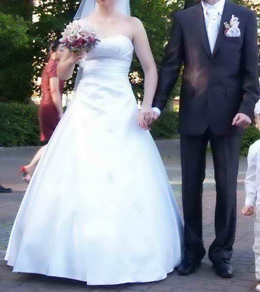 Po uroczystościach suknia została poddana czyszczeniu chemicznemu, dzięki czemu jej stan jest idealny. Rozmiar sukni to 36-38, jednoczęściowa, linia "A", sznurowana z tyłu, gorset wzmocniony fiszbinami, szyta na osobę o wzroście 167 cm + 5 cm obcas.
