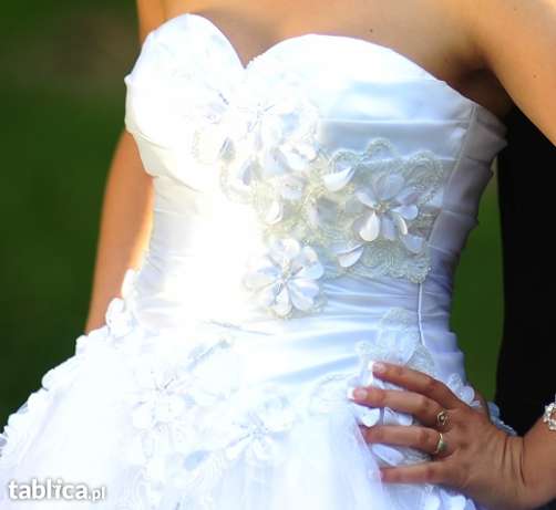 Mam do zaoferowania białą suknię ślubną.Gorset jest zdobiony kwiatami,regulowany do rozmiaru 38-40.Suknia jest na kole,dół jest z połyskującego materiału co daje piękny odcień bieli.Gratis dodam bolerko na krótki rękaw oraz welon.serdecznie zapraszam do obejrzenia i przymiarki.