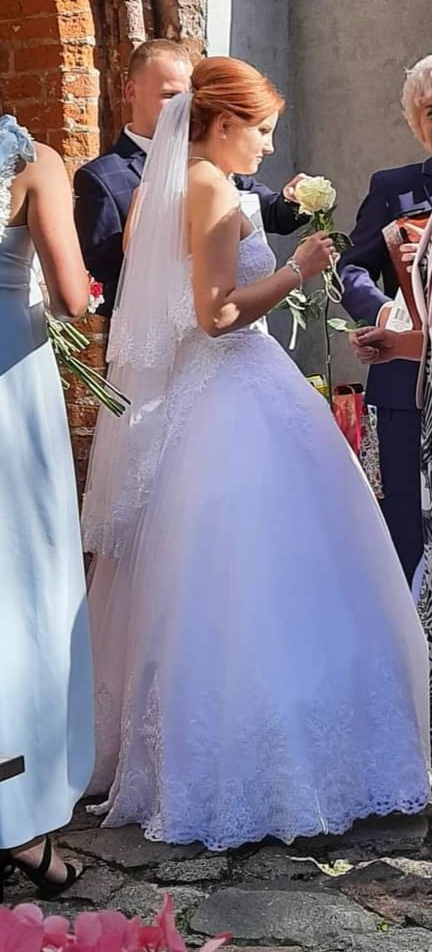 Sprzedam suknię ślubną. Wyprana w pralni. Druga właścicielka :) kupiłam w salonie, wystawiona była w komis; nowa ok 4000 tys., kupiłam używana za 2700zl.,sama pralnia kosztowała 300 zł. Interesuje mnie cena 1300 zł. I tak sporo straciłam,mozemy po negocjować. Polecam piękna biała, "ksiazniczka". Ogólnie rozm. 40, regulowana gorsetem więc na rozm większy i mniejszy będzie dobra. Mój wzrost 168. Miałam lekki obcas i była idealna do ziemi. Polecam. Piekny biały welon z koronka.