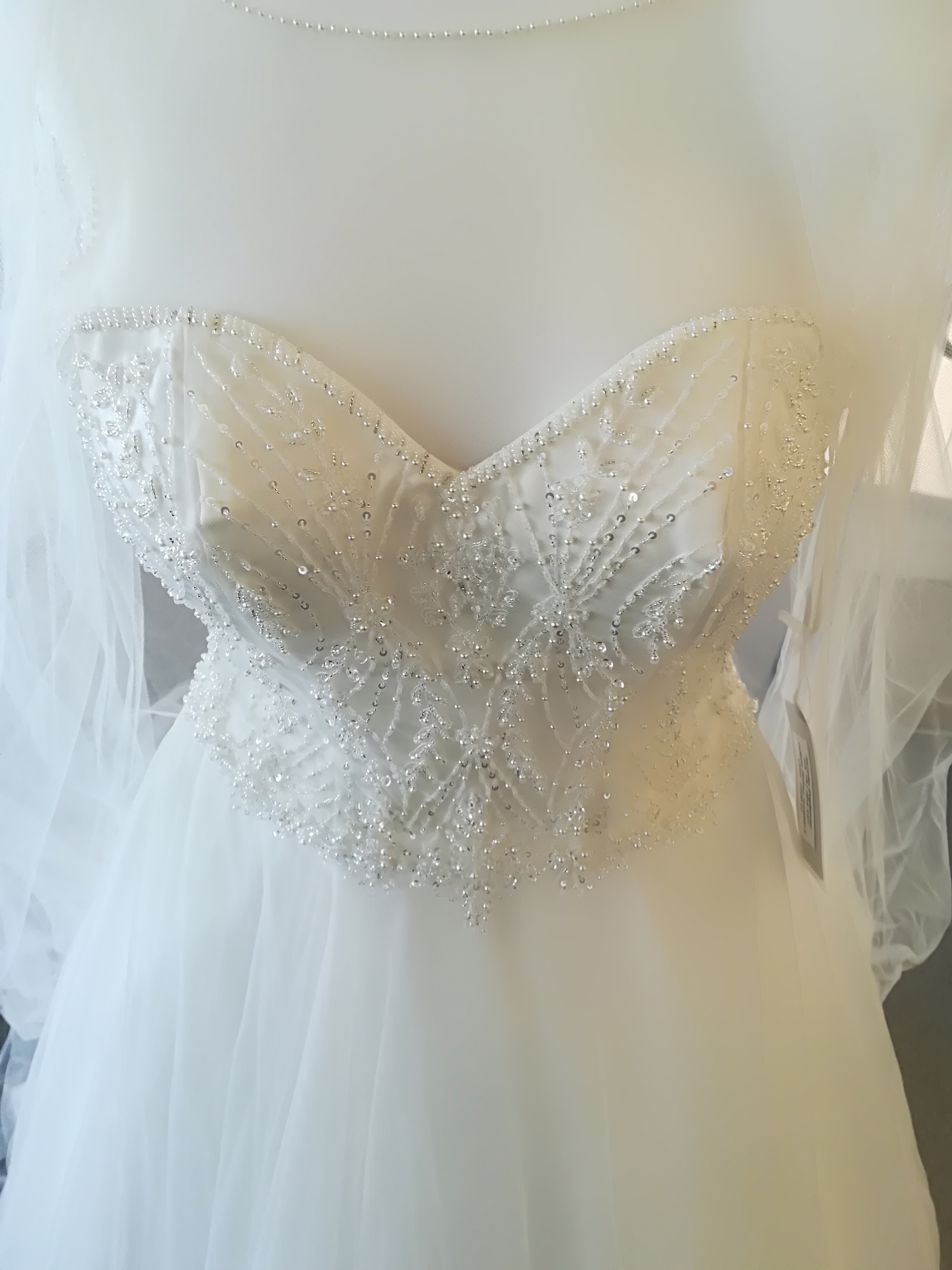 Suknia posiada ręcznie wyszywany gorset. Do gorsetu doszyta została koronka z guzikami na plecach (można ją zlikwidować). Gorset posiada wewnątrz niezastąpiony pas z regulacją dzięki któremu suknia leży na swoim miejscu i nic się nie zsuwa!
