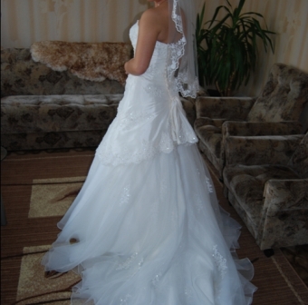 Suknia wykonana jest z tafty połączonej z tiulem. Na tafcie liczne koronki z przyszytymi kryształkami. Piękne wiązanie z tyłu umożliwia idealne dopasowanie sukni. Suknia posiada tren, który można podpiąć.