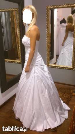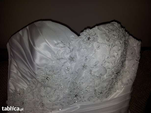 Sprzedam suknie ślubną w kształcie litery A z halką. Rozmiar sukni 34-36, wzrost 160 cm dodaykowo miałam obcas 7cm ale myślę ze spokojnie z tolerancja do 10cm ze względu na lekko przedłużony tył. Wiązana z tyłu co pomaga w regulacji w biuście oraz w pasie,dobrze dopasowuje się do różnego rodzaju sylwetki. Stan sukni uważam za bardzo dobry. Suknia została poddana czyszczeniu chemicznemu. Gratis welon 180cm oraz bolerko z takim samym wzorem haftu jak na sukience. Sukienka do obejrzenia w Policach.