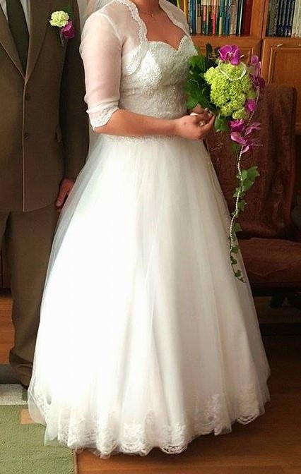 Suknia Ślubna taka jak na zdjęciach. Dla osoby w rozmiarze 38/40.Do sukni jest halka z dużym kołem Bolerko rozmiar 40 . Welon 2 warstwy jedna dłuższa druga krótsza.