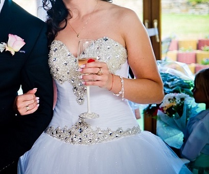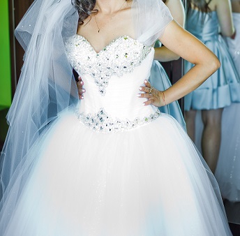 Gorset sukni jest bogato zdobiony z ręcznie przyszywanych kryształków Svarowskiego, które pięknie błyszczą (widoczne na zdjęciach). Ułożenie kryształków tworzy nie połączony kształt klepsydry, dzięki czemu suknia optycznie wyszczupla. Gorset wiązny z tyłu dzięki czemu podkreśla talię i biust oraz daje możliwość regulacji rozmiaru (zwężenie i poszerzenie). Z tyłu gorsetu znajduje się miejsce na schowanie 'sznureczka'. Wykonana jest z kilku warstw tiulu oraz białej halki. Sukienka po mimo tylu wrstaw tiulu jest lekka oraz wygodna. Pięknie się kręci podczas obrotu, rozkłada w czasie podnoszenia oraz podczas sesji zdjęciowej. Do sukni dołączone jest koło , torebka, biżuteria,pudełko na koperty.