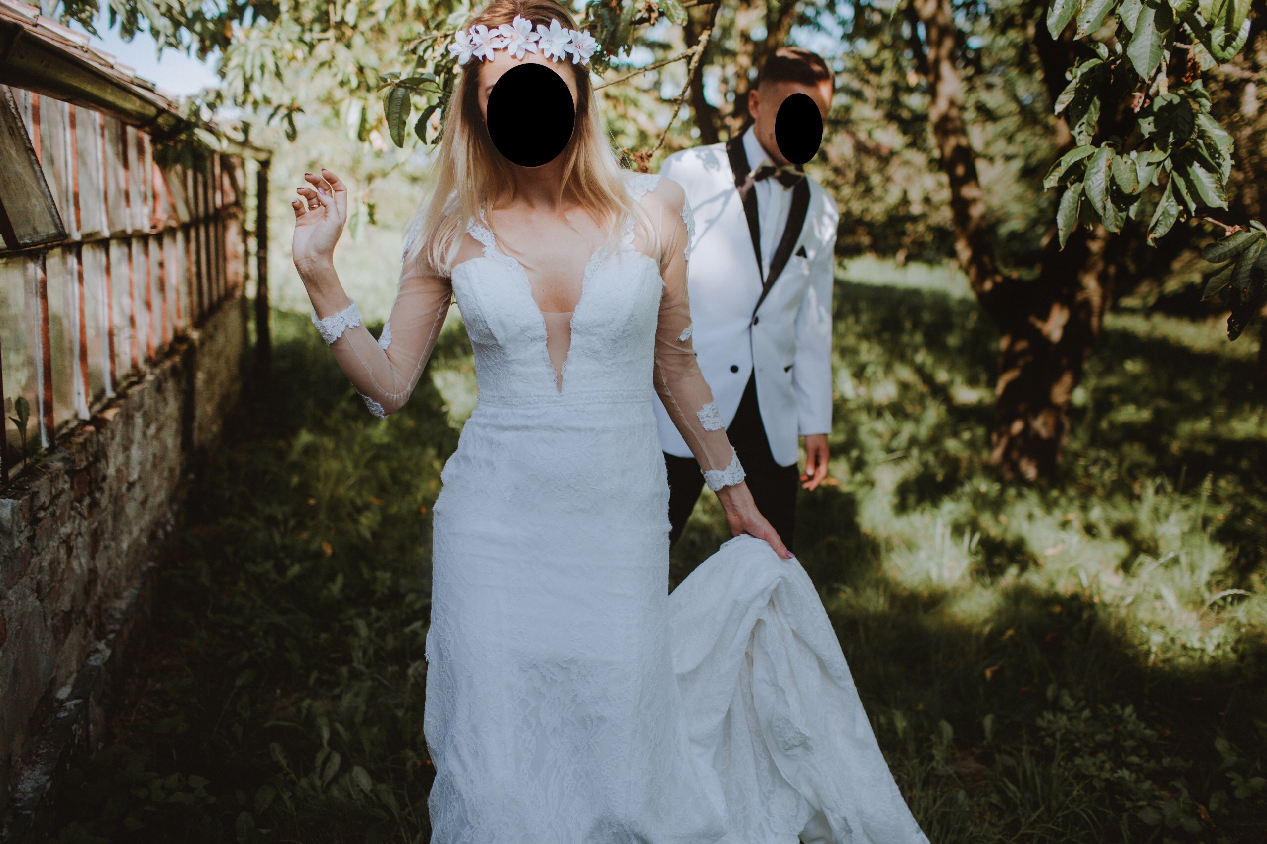 Koronkowa suknia ślubna wraz z długim ok 3 metrowym welonem. Długi rękaw z koronkowymi zdobieniami, sukienka kupiona w jednym ze szczecińskich salonów w 2017 roku.