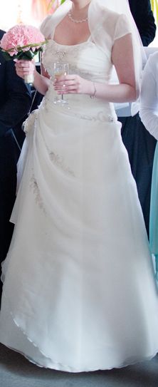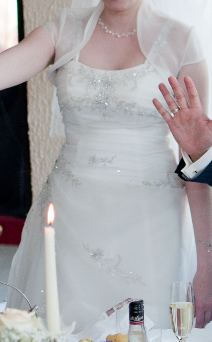 Suknia pięknie się błyszczy, jest zdobiona kryształkami, do sukni lekko doszyte ramiączka (co jest niezbędne przy dużym biuście), ale bez problemu można je odpruć. Istnieje możliwość przymierzenia sukni w Szczecinie.