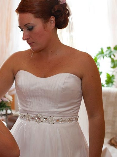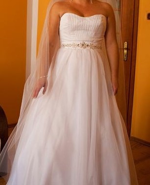 Bajeczna suknia ślubna zakupiona w maju 2011 roku w Centrum mody ślubnej w Szczecinie za 3 000 zł. Suknia jest z kolekcji Aspera Bride Collections model 4514 i wykonana jest z nadzwyczajnie miękkiego i zwiewnego materiału soft organza w kolorze śnieżno białym. Suknia jest jednoczęściowa, w części gorsetowej delikatnie plisowana i odcinana w talii przepięknym satynowym pasem wyszywanym (nie wyklejanym) perełkami i srebrnymi oraz kryształowymi kamieniami Swarovskiego. Dzięki temu zaznaczona jest talia a dekolt w kształcie serca uwydatnia i podkreśla biust. Suknia nadaje sylwetce piękną linię, wyszczupla, podkreśla kształty - jest bardzo kobieca, a przy tym niezwykle lekka zwiewna i wygodna. Posiada długi tren z możliwością podpięcia go na dodatkowy guzik, dzięki czemu nie przeszkadza w tańcu. Tył sukienki wiązany tasiemką wykonaną z nieślizgającego się materiału, co pozwala na swobodne i solidne związanie. Kreacja nie jest podarta ani postrzępiona, oprócz przymiarki była założona dwa razy: w dniu ślubu i na sesji zdjęciowej (jestem pierwszą właścicielką) - po czyszczeniu. Pod suknie można założyć dodatkową halkę z kołem, ja nie zdecydowałam się na to chcąc podkreślić jej zwiewność.