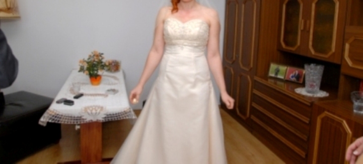 Sprzedam suknię ślubną Aspera w kolorze light gold (lekkie złoto - bardziej złotawe ecru). Suknię kupiłam w salonie Centrum Mody ślubnej w Szczecinie, sukienka kosztowała 2900 zł. Suknia ślubna jest jednoczęściowa, pod biustem znajdują się efektowne kamienie i kryształki Svaroskiego, na plecach sznurowania ( do końca pleców, co daje możliwość regulacji). Piękna i bardzo elegancka Suknia zachwyci niejedną pannę młodą. Suknia została założona jeden raz, została odświeżona i profesjonalnie wyczyszczona.