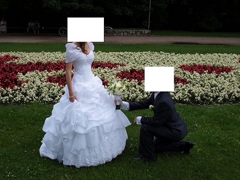 Sprzedam Suknie Ślubną- białą z Trenem ! Rozmiar sukni to podział pomiędzy 34-38, doskonale daje się dopasować dzięki sznurowaniu na gorsecie. Długość sukni dopasowana do wzrostu 166cm +5cm obcas. Można ją wydłużyć, dzięki puszczaniu koronek(skorzystaj z pomocy krawcowej). Sukienka jest jednoczęściowa, gorset częściowo -na tali wyszywany jest w koronkę(która ma dodatki błyszczące ) i dół sukienki tak samo. Sukienka była ubierana tylko 1 raz w dniu ślubu i tylko przeze mnie!
