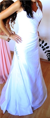 Witam. Mam do sprzedania piękną suknię ślubną. Polecam dla każdej Pani, która w tym szczególnym dniu chce się poczuć seksownie i elegancko. Suknia jest w bardzo dobrym stanie. Miałam ją tylko na swoim ślubie we wrześniu. Jest jednoczęściowa, góra gorsetowa wiązana z tyłu, idealnie dopasowuje się do każdej sylwetki. Suknia ma częściowo odkryte plecy. Naszyjnik w postaci ramiączek zapinanych na szyi biegnie z tyłu sukienki wzdłuż wiązania gorsetowego. Naszyjnik pokryty jest bardzo dużą ilością drobnych kryształków Swarovskiego - przez co przepięknie się mieni w świetle. Do sukni dołączam dwa welony typu mgiełka wykonane z delikatnego tiulu (jeden krótki, drugi długi-250cm). Rozmiar sukni to 36-38.