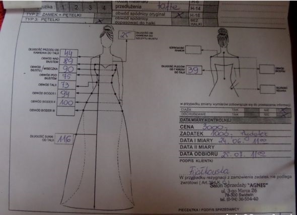 mam do zaoferowania prześliczną suknię ślubną zakupioną w salonie AGNES. Suknia jest biała, zdobiona kryształkami swarovskiego. Z tyłu ma podpinany tren. Gorset sznurowany (dodatkowo wcześniej usztywniany gumą na haftki). Idealnie przylega do ciała i dobrze się trzyma.