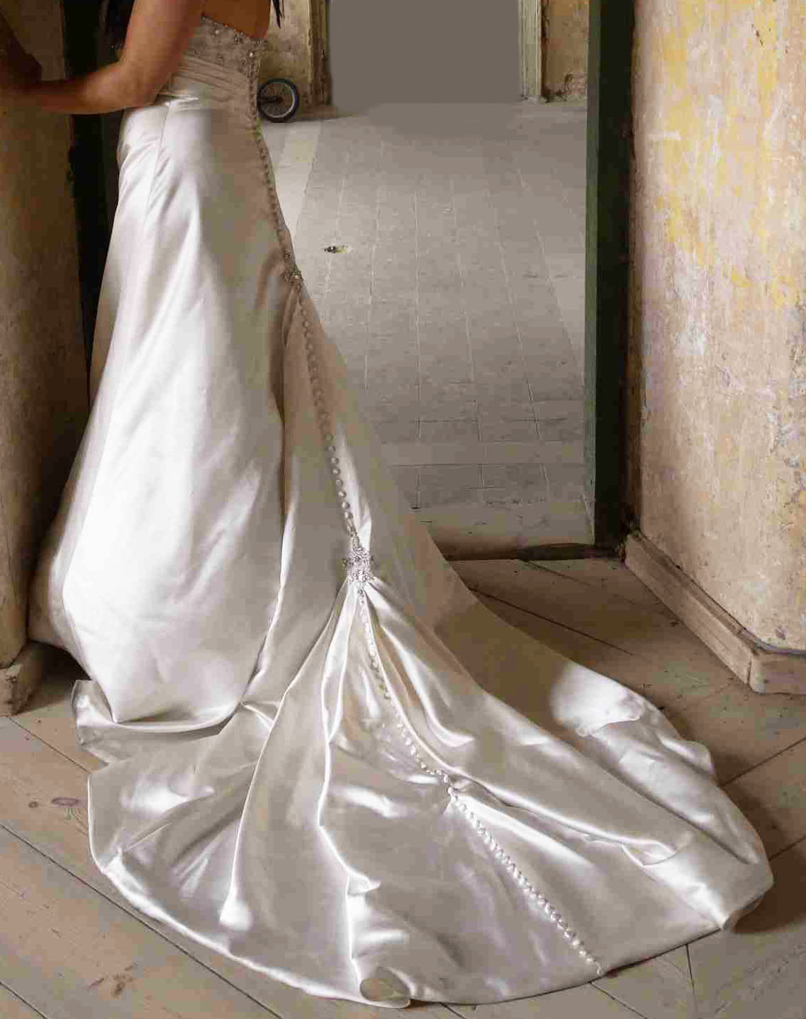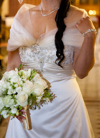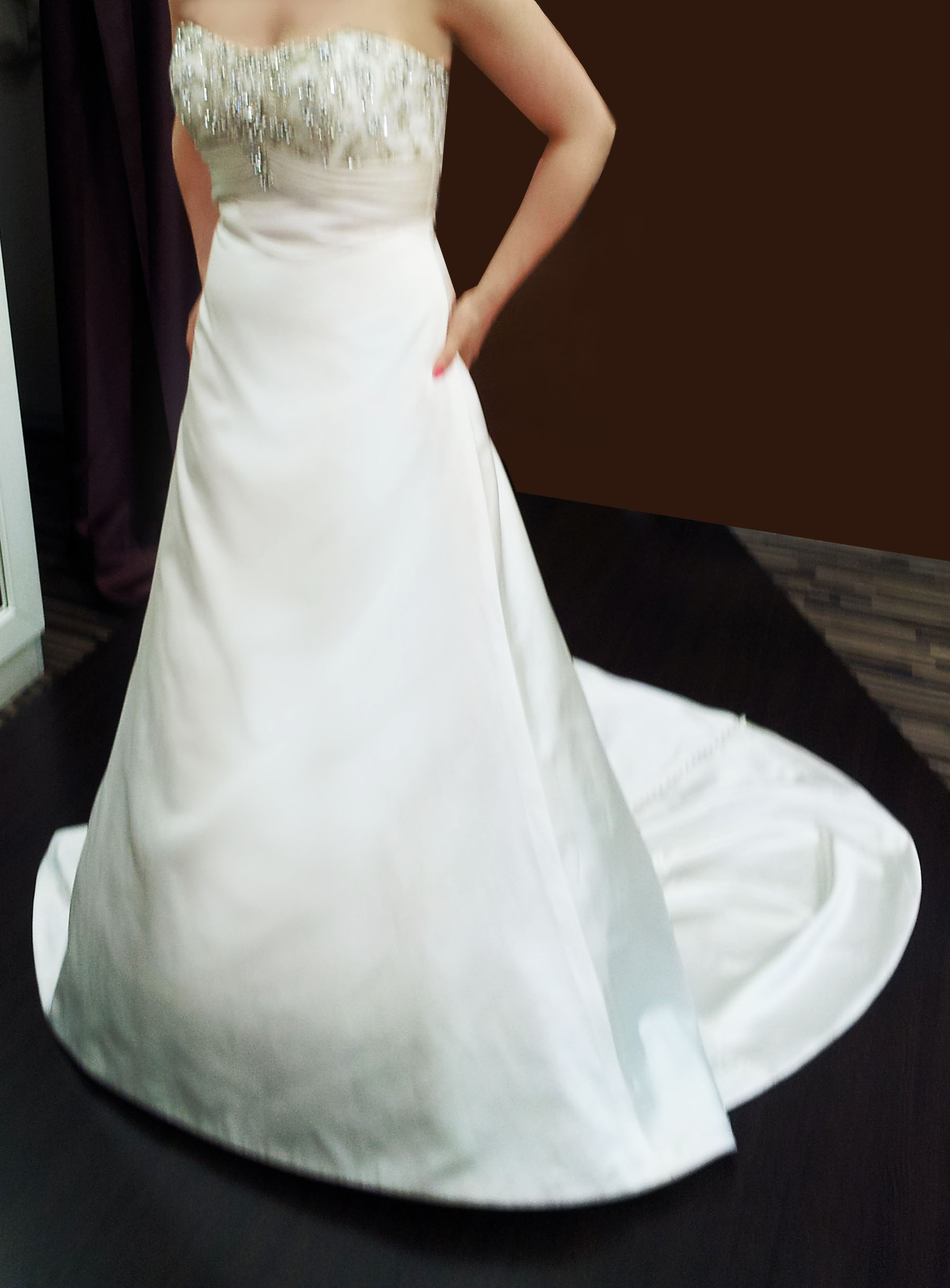 Suknia ślubna Lisa Ferrera Demetrios GR183- przepiękna i elegancka, atłasowa suknia ecru w fasonie A, prosta od dołu ze wspaniałym podpinanym trenem, góra to gorset bogato wyszywany cyrkoniami swarovskiego i szklanymi koralikami. Materiał gładki, lekko połyskliwy. Z tyłu zapinana na guziki. Całość daje niesamowity efekt. Gorset podkreśla talię i dekolt (specjalny biustonosz jest wszyty w gorset). Suknia ma niepowtarzalny wygląd i niesamowity komfort noszenia. Do sukni dodatkowo jest halka z kołem. Sukienka na rozmiar 38, wzrost 168cm+ buty 9cm. Długość można również regulować halką. Suknia kupiona w salonie Lisa Ferrera w Szczecinie za ok.2000 zł. Po ślubie została oddana do profesjonalnego czyszczenia. Gratis dodaje zakupione w salonie dodatki : - woalkę z tiulu z toczkiem wysadzanym cyrkoniami, co doskonale pasuje do sukni - szal tiulowy z cyrkoniową broszką - buty rozmiar 38 (bardzo wygodne i tylko na ślub założone), - pokrowiec na suknię. Na życzenie mogę podesłać więcej zdjęć na maila. Można również umówić się na przymiarkę w Szczecinie. Jest możliwość negocjacji ceny. Zapraszam :)