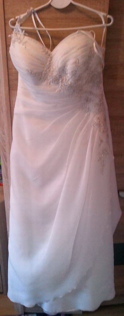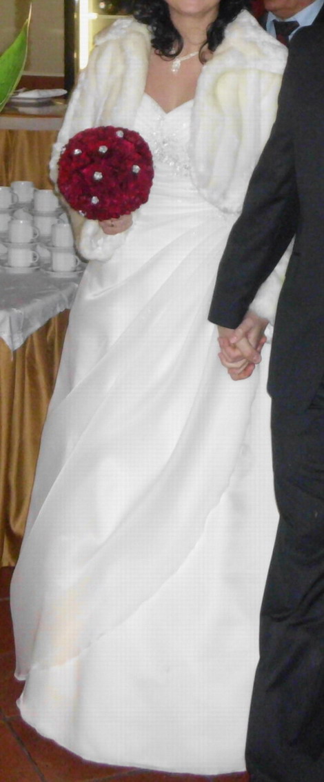 Sprzedam suknię ślubną, delikatny kolor ecru, z trenem z tyłu, jest możliwość podpięcia go, materiał tej sukni w ogóle nie gniecie się, rozmiar 42,nie była wogóle przerabiana, dostosowuje się sama do figury, regulacja z tyłu. Suknia w bardzo dobrym stanie, bez najmniejszych zniszczeń. Bardzo ładnie leży na ciele, wygodna w noszeniu, maskuje niedoskonałości, tzn wyszczupla brzuch, biodra, uwydatnia biust. Dołączam do niej halkę. Naprawdę polecam z czystym sumieniem, suknia zachwyca. Mogę dołączyć więcej zdjęć na życzenie.