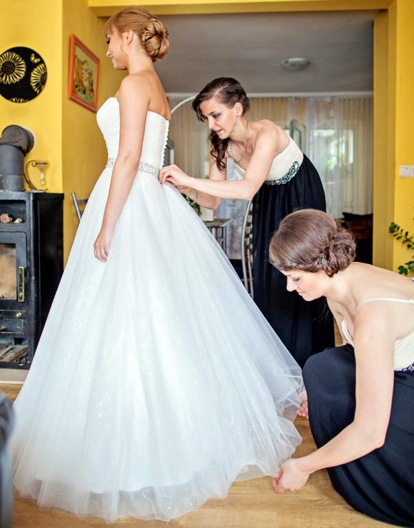 Suknia jest jednoczęściowa, zapinana na zamek, wewnątrz gorsetu znajduje się elastyczny pas który podtrzymuje też suknię. Jest bardzo lekka.