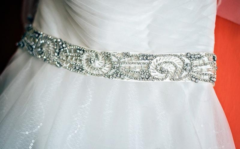Pas z kryształkami dodaje elegancji ale też blasku, suknia od pasa w dół zdobiona delikatnymi cekinami widocznymi na zdjęciu.