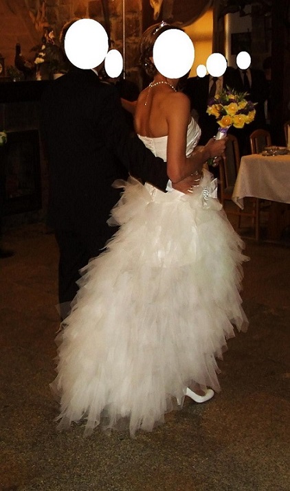 Suknia została uszyta na osobę o wzroście około 170/172 cm (plus obcas 9 cm), jest w kolorze śmietankowym i składa się z warstw "szarpanego" tiulu co nadaje jej lekkości i sprawia wrażenie delikatnej. Dzięki delikatnym "marszczeniom" na gorsecie doskonale podkreśla talię. Rozmiar 36-40 poprzez sznurowanie gorsetu można regulować rozmiar a na prawym boku w okolicy talii posiada ozdobną wysadzaną cyrkoniami kokardę którą można odpiąć.