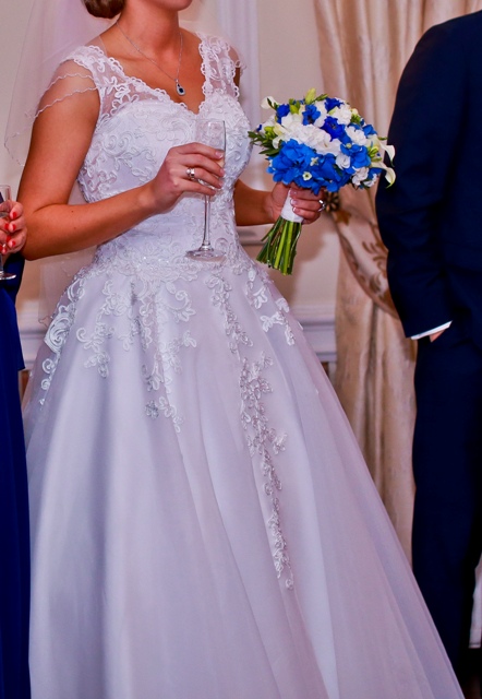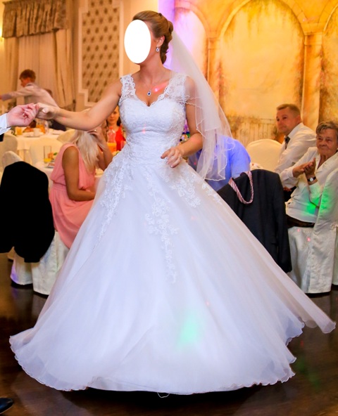 Suknia pięknie układa się w tańcu i jest bardzo wygodna do noszenia (nie ma trenu utrudniającego taniec, nie spada się i nie zsuwa z biustu dzięki ramiączkom).