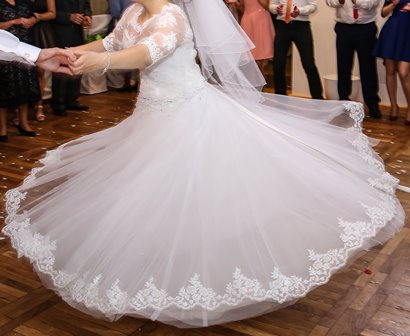 Cena do negocjacji ze względu na drobne przybrudzenia. Suknia wymaga odświeżenia w pralni chemicznej.