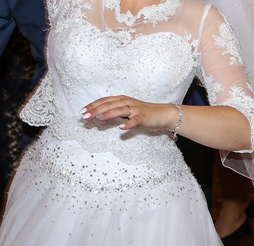 W sukni został przerobiony dół (przyszyta koronka z koralikami) oraz zamiast szala posiada koronkowe z koralikami bolerko.