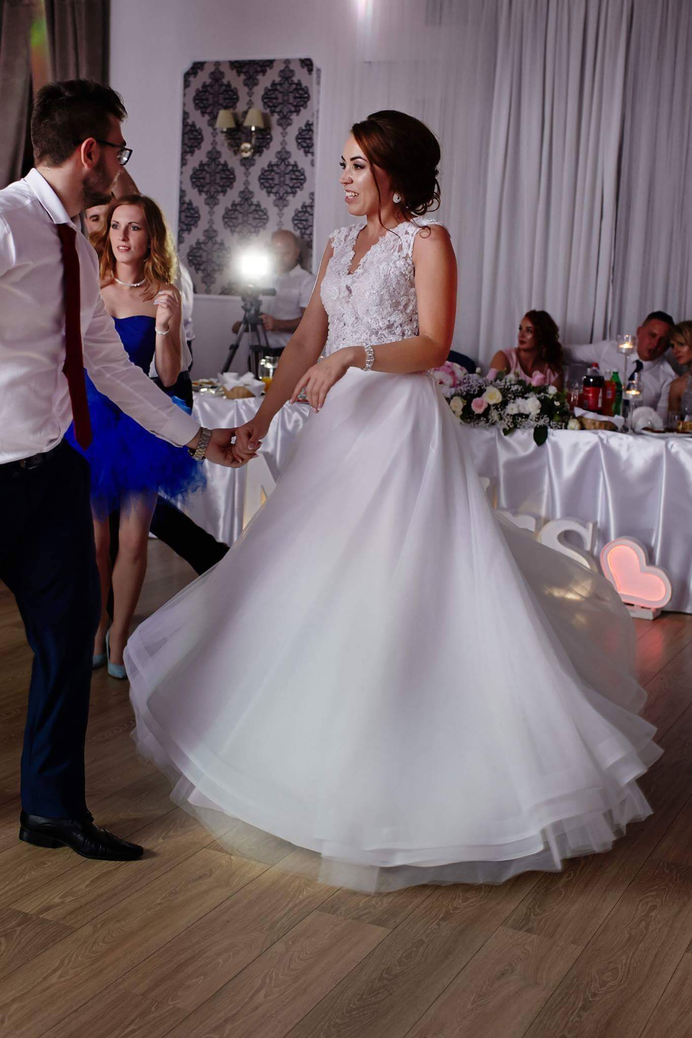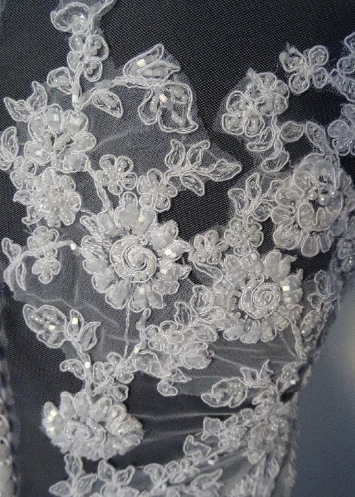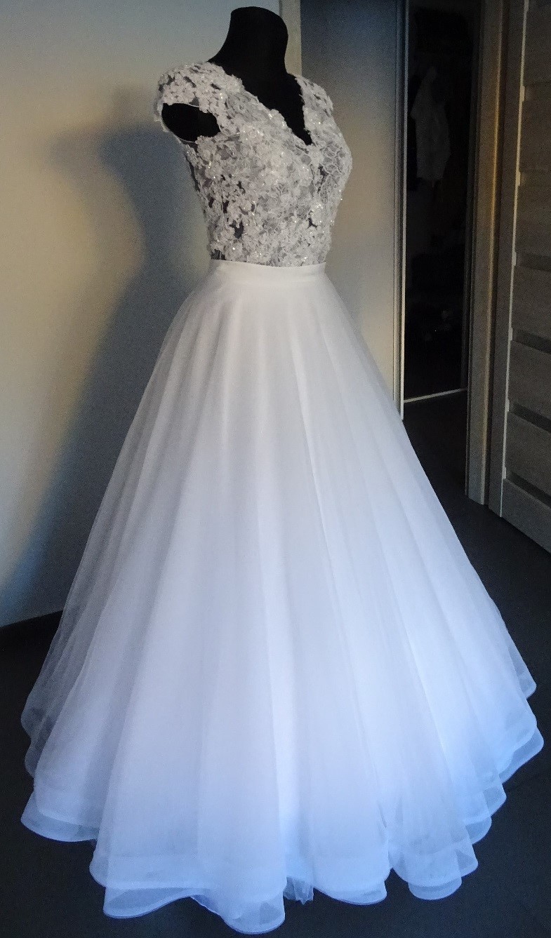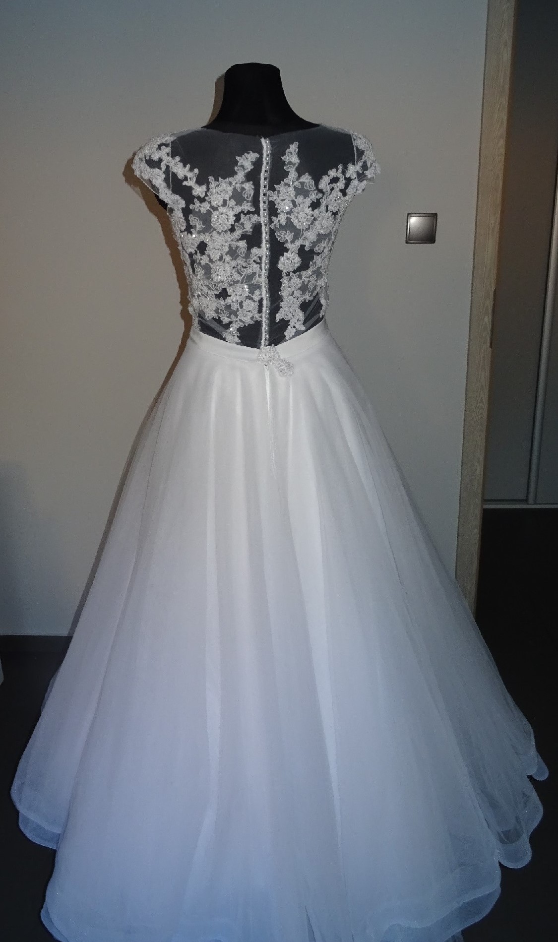 Mam do zaoferowania suknię ślubną. Suknia została zakupiona w tym roku w salonie sukni ślubnych w Szczecinie. Suknia była założona dwa razy - w dzień ślubu oraz na sesję zdjęciową. Suknia została wyczyszczona w profesjonalnej pralni chemicznej. Suknia składa się z koronkowego body i spódnicy z bawełnianego tiulu. Suknia jest niesamowicie lekka i wygodna. Body pokryte jest trzema warstwami ręcznie naszywanej koronki, ozdobione delikatnie połyskującymi kamyczkami. Spódnica wykonana z bardzo dobrej jakości materiału, co powoduje, że przepięknie układa się w tańcu.