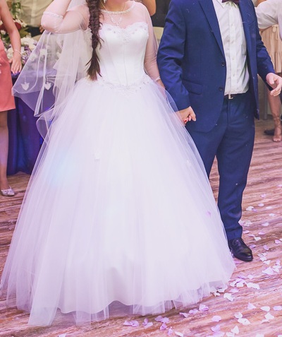 Dodatki w cenie: długi welon - widoczny na zdjęciu, bolerko doczepiane do sukni z tiulu oraz halka na kole. Sukienka jednoczęściowa.