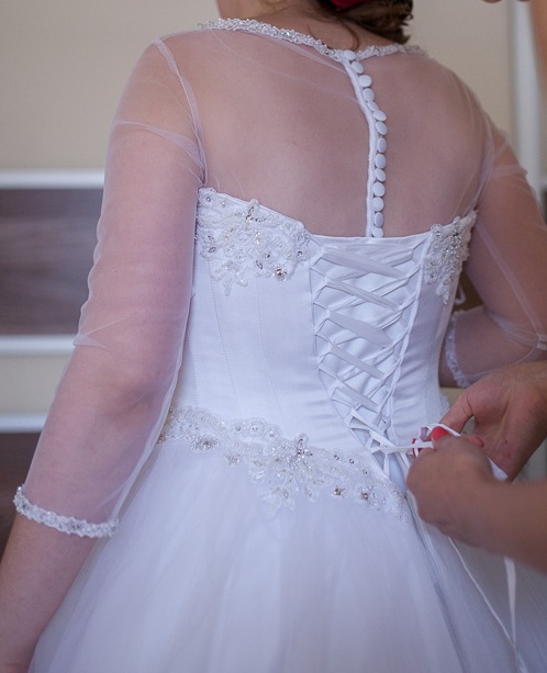 Szyta na 160 cm + wysokość obcasa 7cm. Suknia z halką na kole. Halka jest lekka i zakładana osobno. Gorset regulowany, wiązany, zdobiony kryształkami .