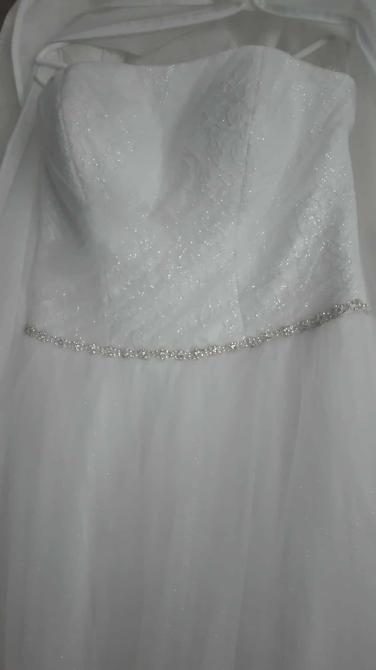 na wzrost około 164 cm , rozmiar biustu 75E ,tiul sukni mieni się brokatem, Suknia wyprana , ubrana 1 raz , zewnętrzna warstwa tiulu delikatnie uszkodzona do delikatnych przeróbek , gratis koło do sukni ,
