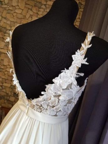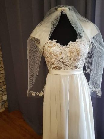 Witam, do sprzedania mam ultralekką suknię ślubną. Suknia była szyta na miarę. Kolor sukni ecru. Góra wykonana z koronki na beżowym podkładzie, wykończona na bokach fiżbinami. Plecy odkryte. W talii satynowy paseczek, który można odczepić. Dół sukni to delikatny lejący się muślin z rozporkiem. Rozmiar 34-36, możliwość przerobienia do rozmiaru 38. Bolerko i welon w gratisie :)