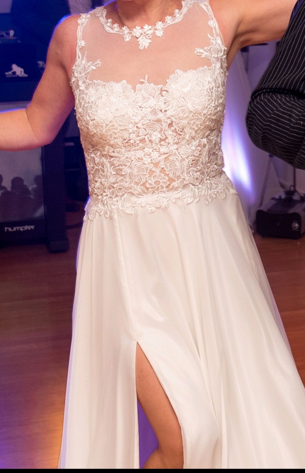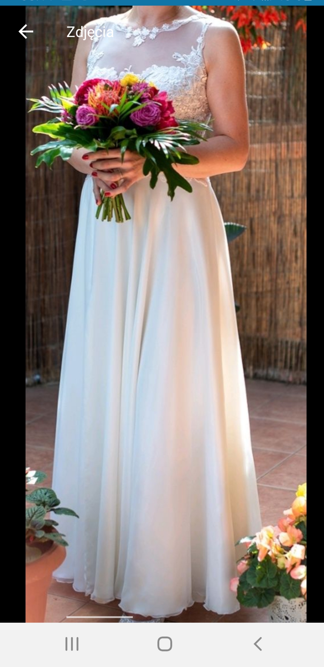 Sprzedam suknie slubna, która miałam raz na sobie. Suknia długa z dużym rozcieciem. Cena pierwotna w salonie Agnes 3600. Ja mam 168 i miałam buty około 10 cm. Polecam