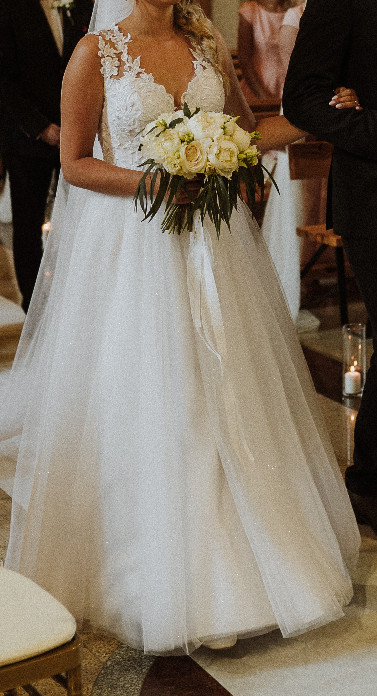 Sprzedam suknie ślubną, szytą na miarę (rozmiar 38, wzrost 168cm+9/10cm buty) w salonie sukien ślubnych LaPerle w Szczecinie. Suknia w kształcie litery A , jedna warstwa tiulu brokatowa, była prana chemicznie. Do sukni dorzucam welon długi i krótki. Więcej informacji na priv. Cena do uzgodnienia.