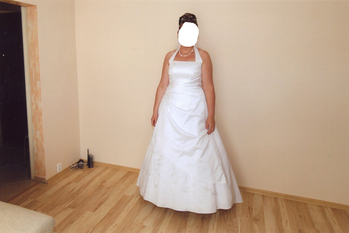 Witam! Mam do sprzedania oryginalną suknię ślubną projektu Madame Zaręba - model Migela. Suknia jest jednoczęściowa, satynowa, koloru białego, rozmiar 44, na wzrost 176cm (miałam buty na 3cm obcasie). Suknia szyta w salonie, noszona tylko raz bez sesji w plenerze, obecnie po praniu jest w stanie idealnym. Krój klasyczny "A" ładnie podkreśla kobiece kształty i maskuje niedoskonałości. Jest sznurowana na plecach jak gorset, co ułatwia dopasowanie jej do figury. Suknia ma śliczne delikatne zdobienia ze srebrnej nitki i błyszczących koralików. Posiada własną halkę,ale można założyć dodatkową dla spotęgowania efektu. Bardzo wygodna i lekka. Suknia wiązana na szyi, posiada niedługi tren pięknie prezentujący się w kościele który potem można bardzo łatwo podwiązać, żeby szaleć całą noc. WYMIARY: BIUST- ok 92cm POD BIUSTEM - ok 75 cm PAS - ok 85 cm Do sukni dodaję welon z satynową lamówką, dodatkową halkę z kołem oraz naszyjnik z satynowymi różyczkami który idealnie pasuje do sukni. Sama suknia w salonie kosztowała 2 tyś złotych. W razie pytań proszę o kontakt telefoniczny -608 535 022 lub na e-mail: temis@onet.eu Można przyjechać i obejrzeć suknię na terenie Szczecina.