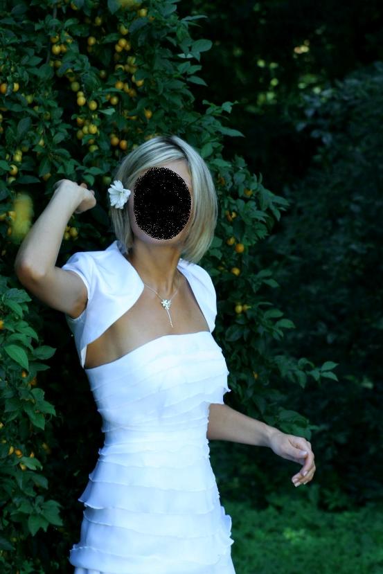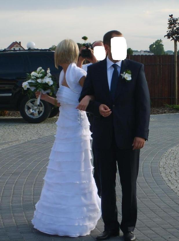 Witam serdecznie. Oferta dotyczy niezwykłej sukni ślubnej, białej, z bardzo modnym motywem falbanek, trenem wygonie podpinanym, lekkiej i subtelnej. Suknia pięknie układa sie w tańcu i nie utrudnia poruszania. W cenę jest wliczone bolerko zakrywające ramiona. Polecam zakup - w końcu to strój na wyjątkowy dzień w życiu.