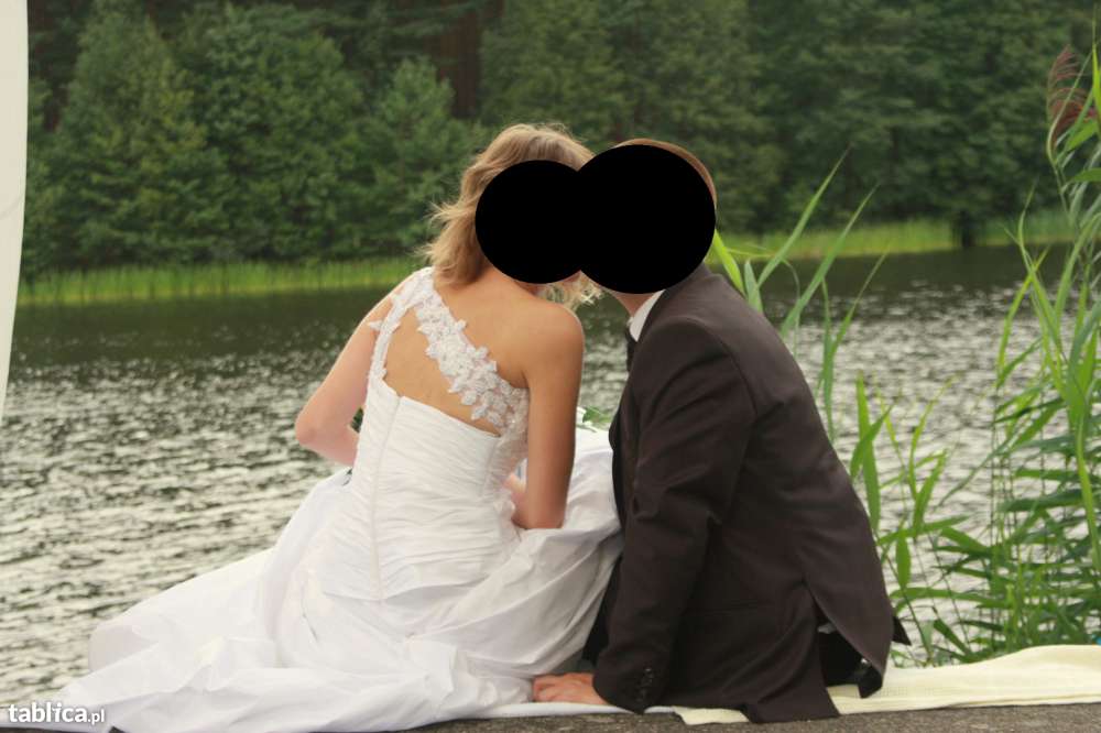 Suknia z firmy Gala, Pamela . Kosztowała 2400zł.Na jednym ramiączku z delikatnymi srebrnymi zdobieniami. Tył sukni oryginalnie wykonany. Na szczupłą osobę, wzrost 170- 176, rozmiar: 38-40. (możliwość przerobienia) Jest wyprana po ślubie.