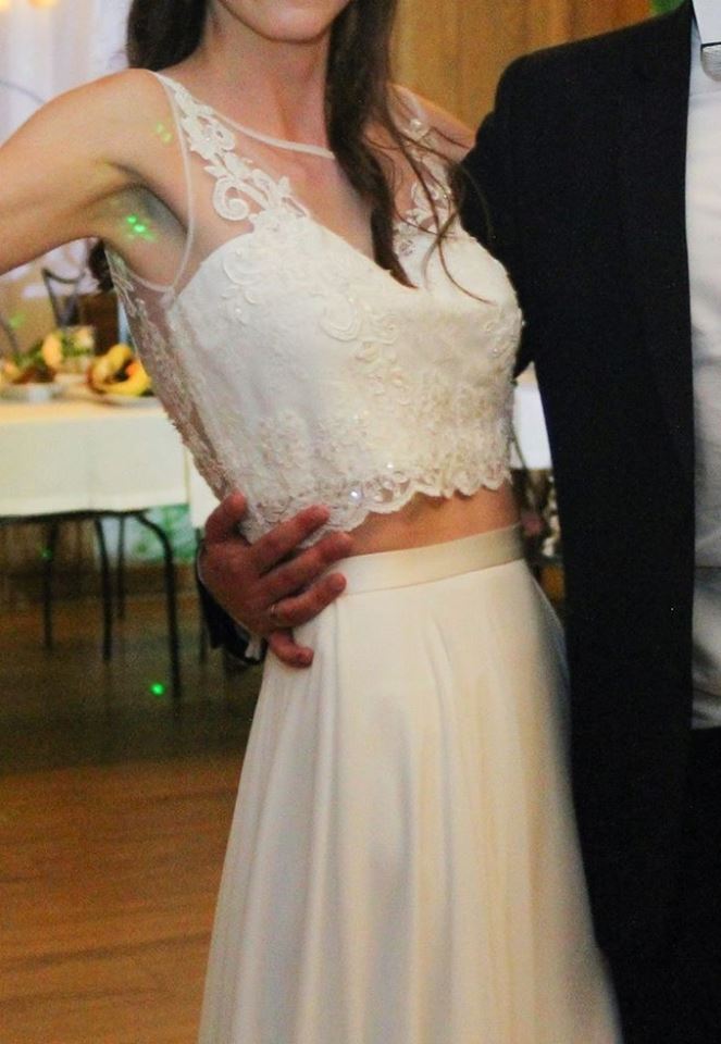 Sprzedam delikatną, romantyczną suknię ślubną. Jest wyjątkowa, że względu na to, że składa się z dwóch części: koronkowej tuniki i spódnicy. Na bokach są delikatne, niewidoczna zastrzaski, które można zapiąć.