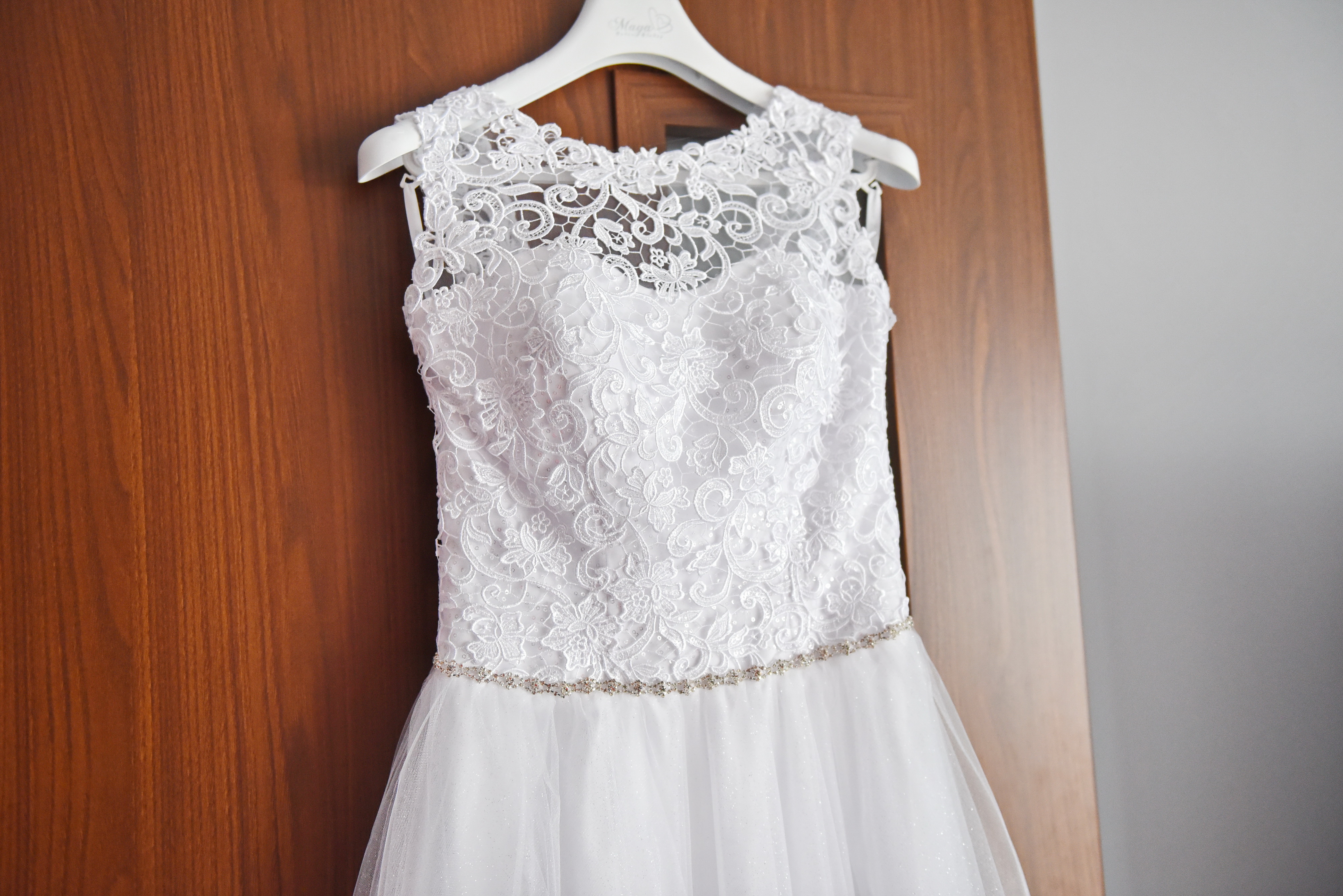 Góra sukni składa się z pięknej gipiury zakończonej srebrnym paskiem. Dół sukni to kilka warstw tiulu wykończonego brokatem, który pięknie wygląda w świetle dziennym. Suknia posiada pięknie wycięte plecy, jest wiązana oraz posiada wszyte szelki abym mogła założyć na spokojnie do niej stanik, co w chwili ślubu było dla mnie bardzo ważne ponieważ karmiłam wtedy piersią. Pani z salonu zapewniła ze suknie można dopasować do Pań z rozmiarem 38-42. Do sukni dorzucę welon i kolczyki.